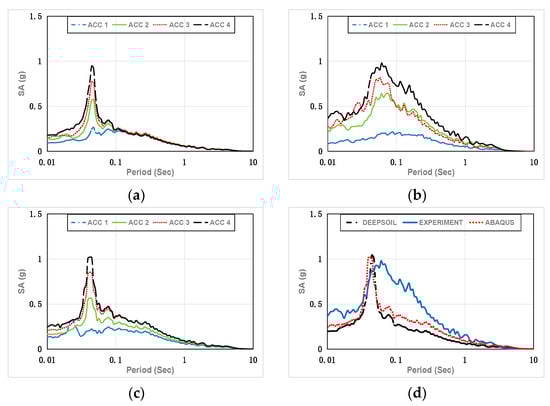 Spectral Acceleration of the artificial seismic wave in Case 3. (a) DEEPSOIL results; (b) experimental results; (c) ABAQUS results; (d) DEEPSOIL, experimental, and ABAQUS results (ACC 4).
