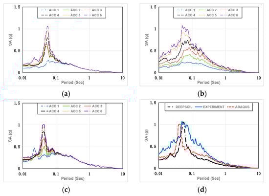 Spectral Acceleration of the artificial seismic wave in Case 4. (a) DEEPSOIL results; (b) experimental results; (c) ABAQUS results; (d) DEEPSOIL, experimental, and ABAQUS results (ACC 6).