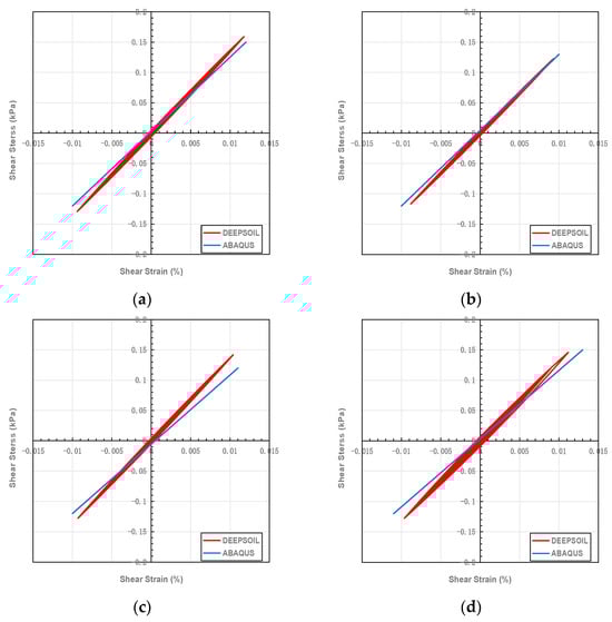 Figure 17 illustrates the stress–strain curves for the artificial seismic waves in Cases 1, 2, 3, and 4. In the numerical analysis, DEEPSOIL used the Darendeli nonlinear constitutive model; this model characterizes soil behavior by incorporating nonlinearity, hysteresis, and strain rate effects. ABAQUS employs the Mohr–Coulomb plasticity model for simulating the behavior of soils under various loading conditions.