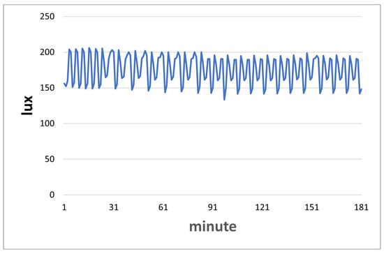 The experimental results showing the effect of controls in Section 2.1. The mean light intensity remains close to (175 lux) under the light control system (Algorithm 1).