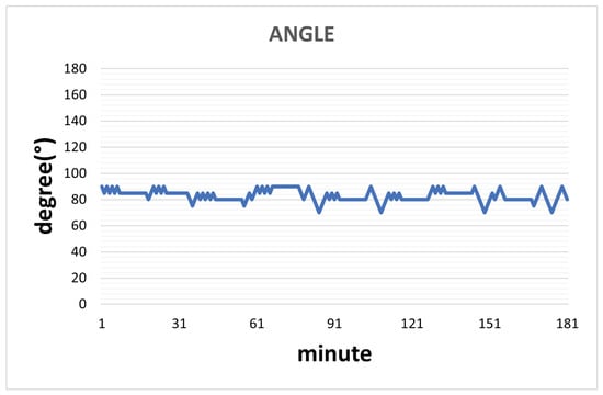 Figure 5 shows the change of RB angle (in degrees) associated with the experiments in Figure 4. In Figure 5, Algorithm 1 is utilized to control the RB for providing the optimum amount of sunlight. Once we set a RB angle using Algorithm 1, we maintain the angle for min until moving the RB again.