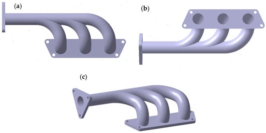 (a) Top view of the exhaust manifold. (b) Bottom view of the exhaust manifold. (c) Isometrical view of the exhaust manifold.