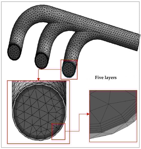 In near-wall regions, the solution gradients are very high, but accurate calculations are paramount to the success of the simulation. Since the calculations deal with solid-fluid variables, the near-wall treatment is essential. In Figure 3, mesh inflation is employed around the exhaust gas to ensure a y+ value of less than 1 throughout all simulations. An inflation mode with 5 layers is also used, adding extra layers of mesh cells near the solid boundaries where significant flow gradients are present (e.g., Ouyoussef et al. [35]). These layers are gradually refined toward the wall to provide better resolution of the boundary layer and to capture the flow phenomena in that region. This technique is commonly used in CFD simulations to achieve higher resolution when capturing near-wall flow behavior.