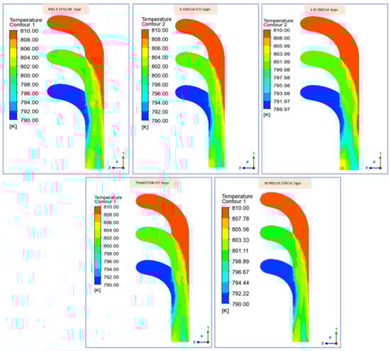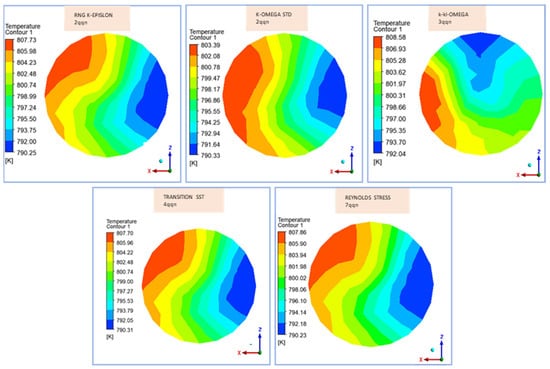 Figure 4 reveals the distribution of the temperature at the outlet of the exhaust manifold using the five turbulence models; all models predict a similar maximum temperature at the outlet, showing that the maximum at the outlet of the exhaust manifold is closely clustered between 807.73 K and 808.58 K, with the k-kl-ω model predicting the highest maximum temperature at 808.58 K. Minimum temperatures vary more, ranging from 790.23 K to 795.56 K, with the Reynolds stress model showing the lowest minimum temperature at 790.23 K. The k-kl-ω model stands out, presenting the broadest temperature range.
