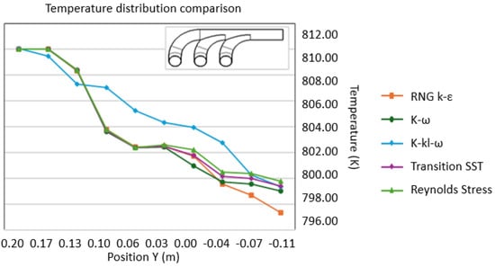 All models show a decreasing temperature trend as the position Y changes from the inlet 0.20 m to the outlet −0.11 m, as shown in Figure 5; k-kl-ω shows the highest temperatures initially, reflecting sensitivity to transitional flows. The RNG k-epsilon model shows a rapid temperature decrease, reaching the lowest minimum temperature, around 798 K, at −0.11 m. K-omega STD and k-kl-ω models display similar trends, with k-kl-ω consistently predicting higher temperatures. The transition SST and Reynolds stress models exhibit closely matched trends, with transition SST initially showing slightly higher temperatures.