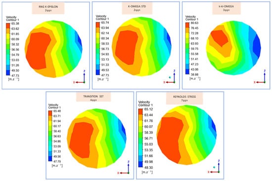 Figure 7 depicts the velocity profiles at the exhaust manifold outlet in the ZX plane. The k-kl-ω model indicates the presence of the highest velocity regions, reaching up to 80.63 m/s, signifying strong transitional flow effects. In contrast, the RNG k-epsilon, k-omega STD, transition SST, and Reynolds stress models exhibit maximum velocities in the 63–65 m/s range. These discrepancies in velocity profiles underscore the distinct capabilities of each model in accurately capturing flow dynamics.