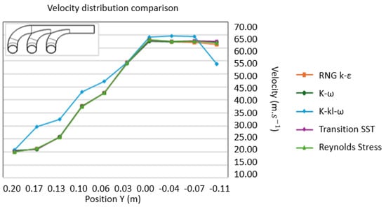 The diagram shown in Figure 8 illustrates how velocity varies across the manifold, with positions ranging from 0.2 m to −0.105 m in the XZ plane. Initially, the velocity at the three inlets is set to 20 m/s as per the boundary condition. As it moves through the exhaust manifold, the velocity gradually increases. The k-kl-ω model stands out with higher velocities, peaking at around 65 m/s and maintaining higher velocities along the exhaust path y-axis; the RNG k-epsilon, k-omega STD, transition SST, and Reynolds stress models exhibit similar peak velocities, at around 63–65 m/s.