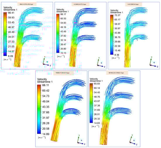 As can be seen, Figure 9 depicts the contour of the streamlined velocity contours across the exhaust manifold, captured for various turbulence models, revealing that all models predict a similar trend in flow patterns with smooth streamlines. The k-kl-ω model predicts the highest velocities (up to 72.27 m/s) and exhibits more complex patterns, effectively capturing transitional flow effects. In contrast, the other models (RNG k-epsilon, k-omega STD, transition SST, and Reynolds stress) show slightly lower maximum velocities (around 65–66 m/s) but maintain well-structured and consistent flow patterns. The k-kl-ω turbulence model uses the length scale variable, which enhances its capability to handle the flows with the manifold while considering the curvature of the inlets. This feature allows the model to represent the domain’s exhaust gases and turbulent structures accurately.