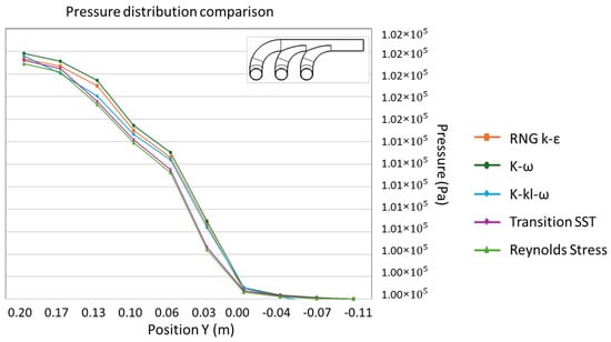 The Figure 10 shows that the exhaust manifold indicates a consistent trend in pressure drop for all turbulence models. The pressure decreases steadily from around 1.02 × 105 Pa at 0.20 m to the defined outlet pressure of 105 Pa at −0.11 m. However, a distinct pressure increase is observed near the midpoint of the exhaust manifold (around 0 m); for all the models, there is a brief increase in pressure followed by a decline. This localized pressure increase suggests a potential point where the flow converges or where it faces resistance within the manifold. This pattern is consistently observed across all models. While there are minor discrepancies, the pressure curves for all models closely align, indicating reliable predictions of the pressure distribution.