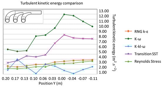 The diagram shown in Figure 11 represents the evolution of turbulent kinetic energy (TKE) along the length of the exhaust manifold for various turbulence models, progressing from the inlet to the outlet.