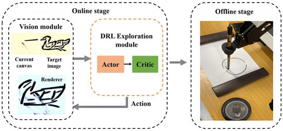 25. Lee, G.; Kim, M.; Lee, M.; Zhang, B.-T. From Scratch to Sketch: Deep Decoupled Hierarchical Reinforcement Learning for Robotic Sketching Agent. In Proceedings of the 2022 International Conference on Robotics and Automation (ICRA), Philadelphia, PA, USA, 23–27 May 2022; pp. 5553–5559. [Google Scholar]