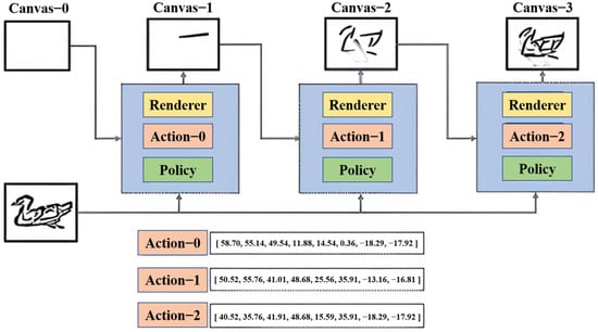 • Action Space: An action, at, is a set of parameters that determine the shape and position of the stroke at step t. An agent’s behavior that maps states to actions is a policy function, π. The state, st, is generated, and then the agent generates the action of the next stroke, at, with the stroke parameters. The agent uses the state based on the transition function st+1 = trans (st, at).