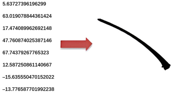 The neural renderer network has several fully connected and convolution layers. Strokes are represented by curves or geometries using several parameters. In general, the parameters include position and shape. The shape of each curve stroke was determined by the thickness of the stroke and the coordinates of control points. Considering that the Bezier curve is a tool used to draw odd shapes with precise accuracy, a curve stroke was designed based on the quadratic Bezier curve. The curve is represented using eight parameters (Figure 3) as follows: