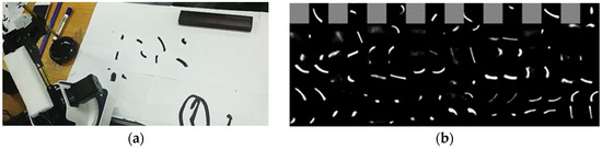 Data collection: A desktop robot, Dobot, which was procured from Shenzhen Yuejiang Technology Co., Ltd. in Shenzhen, China, was used to collect its brush strokes (Figure 5). Traditional Asian calligraphy paper was placed on the table, and the robot drew strokes given a trajectory with eight parameters. The robot drew about 500 different strokes on the paper. We then scanned each piece of paper and saved each stroke as an image. Using the same parameters, we input the renderer and the condition stroke. The condition stroke and the ground truth stroke were fed to the GAN to generate a brush stroke renderer. We used the Dobot Magician Lite robotic arm for renderer generation and painting tasks. It should be noted that this robot arm has five links and four joints. The models were trained on an NVIDIA GeForce GTX Titan X CPU.