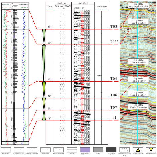 - Seismic reflection characteristics: Moderate-to-high continuity and moderate-to-weak amplitude seismic reflections, with the Nenjiang Formation, from bottom to top, corresponding to seismic reflectors T1, T07, T06, T04, T03′, and T03 (Figure 6).