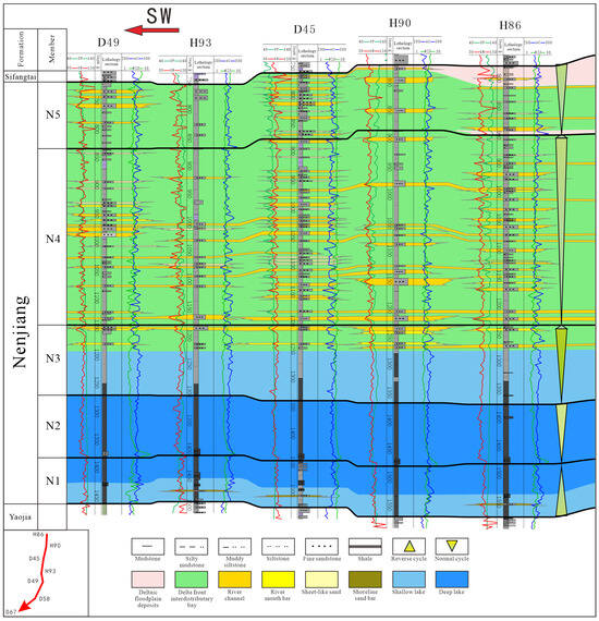 - Cai, Q.S.; Hu, M.Y.; Liu, Y.N.; Kane, O.I.; Deng, Q.J.; Hu, Z.G.; Li, H.; Ngia, N.R. Sedimentary characteristics and implications for hydrocarbon exploration in a retrograding shallow-water delta: An example from the fourth member of the Cretaceous Quantou Formation in the Sanzhao depression, Songliao Basin, NE China. Pet. Sci. 2022, 19, 929–948. [Google Scholar] [CrossRef]