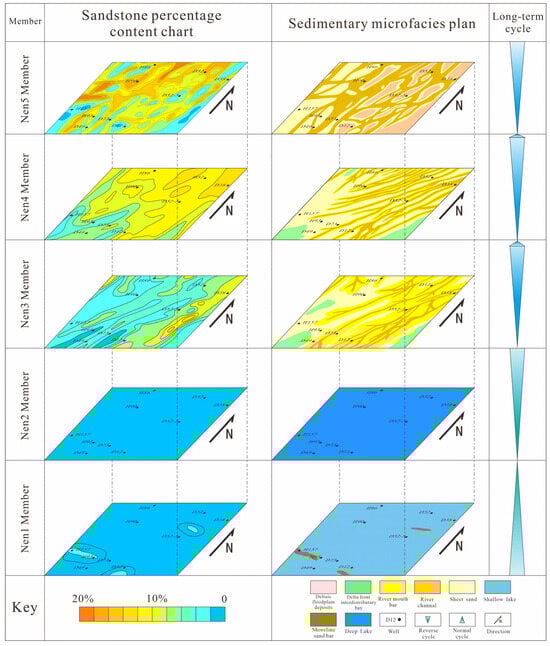 - In the southern part of the Songliao Basin, Da’anbei area, the Nenjiang Formation primarily exhibits two types of sedimentary facies: shallow-water delta and lake. These can be further divided into four subfacies and nine microfacies. Chronologically, the Nen I segment predominantly features littoral shallow lake deposits and the Nen II segment mainly develops semi-deep lake deposits. As the lake level continuously declined, starting from the Nen III segment, delta front deposits began to develop and gradually took a dominant position, eventually transitioning to delta plain deposits by the Nen V segment.