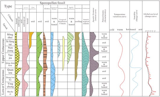 - Tian, M.; Zhang, M.S.; Ren, Y.G.; Qiao, X.Y.; Wan, C.B.; Liu, P.J. Spore pollen algae assemblages and their environment in the third section of the Nenjiang Formation in the Xinzhan area of the Songliao Basin. J. Jilin Univ. (Earth Sci. Ed.) 2005, 35, 449–455. [Google Scholar]