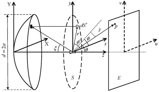 where is the aperture illumination function. , is the polar coordinate on the aperture surface, is the phase error distribution function, , is the wavelength. In Figure 1, S represents the aperture area, p is the far-field observation point, and is the surface element.