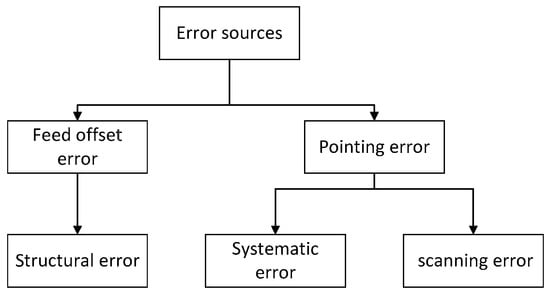Finally, in the actual scanning process of the antenna, there are many factors, such as feed offset error, misalignment of feed phase center and focus, pointing error, noise error, scanning error, and so on. This paper only analyzes the influence of feed offset error and scanning error, and the error influencing factors are not comprehensive enough. Future research should consider more comprehensive error sources, adopt more comprehensive error analysis methods, and consider more influencing factors, which will be the key to improving the accuracy of antenna performance evaluation and system optimization.