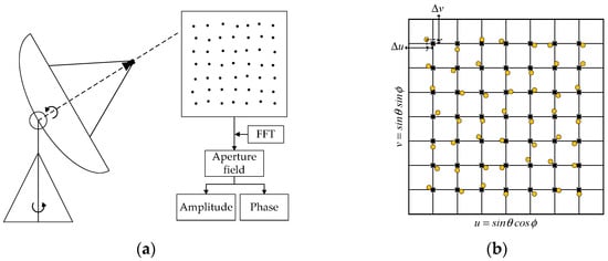 Antenna scanning error: (a) antenna far-field data processing flow; (b) u-v grid far-field data; black points are ideal far-field data; yellow points are far-field data with scanning error.