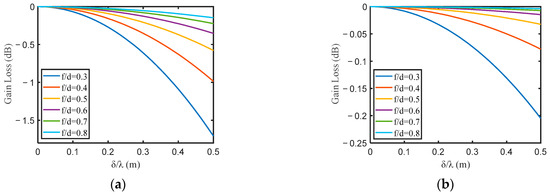 The relationships between the gain loss of different antenna focal diameter ratios and the feed offset error: (a) the influence of the axial offset error of the feed with different focal diameter ratios on the gain loss of the antenna; (b) the influence of the lateral offset error of the feed with different focal diameter ratios on the gain loss of the antenna.