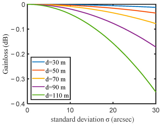 In order to understand more deeply the effect of antenna diameter on the gain loss caused by scanning error, we conducted a series of simulation experiments, as shown in Figure 9. When the standard deviation of the scanning error is controlled at 30 arc seconds, the gain loss caused by the 30 m radio telescope antenna is about −0.014 dB, which is negligible. For a 110 m large-aperture, high-precision radio telescope antenna, the gain loss is about −0.36 dB, which is intolerable for the gain loss caused by a single error. This result indicates that the increase in antenna diameter can improve the signal reception ability of the antenna, and at the same time, it also makes the antenna more sensitive to the scanning error, which negatively affects the gain.