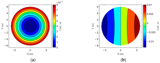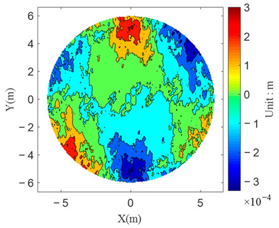 In the previous section, the far-field data caused by the feed offset error was obtained. The far-field data is subjected to the inverse Fourier transform, and the phase distribution is calculated. Substitute it into the Equation (3) to solve the surface measurement error distribution caused by the feed offset error, as shown in Figure 10.