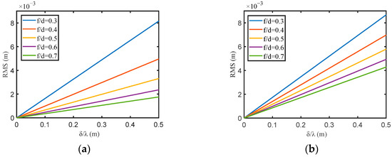 The relationships between the surface shape measurement error of different antenna focal diameter ratios and the feed offset error: (a) the influence of the axial offset error of the feed with different focal diameter ratios on the surface shape measurement error of the antenna; (b) the influence of the lateral offset error of the feed with different focal diameter ratios on the surface shape measurement error of the antenna.