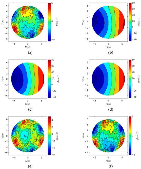 Compensation process for aperture field phase errors caused by feed offset errors: (a) aperture field phase errors caused by surface errors of the antenna; (b) aperture field phase errors induced after incorporating feed offset errors; (c) aperture field phase errors obtained from polynomial fitting; (d) aperture field phase errors obtained from fitting using the proposed method; (e) aperture field phase errors compensated using polynomial fitting; (f) aperture field phase errors compensated using the proposed method.