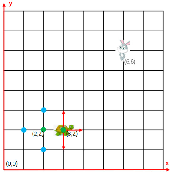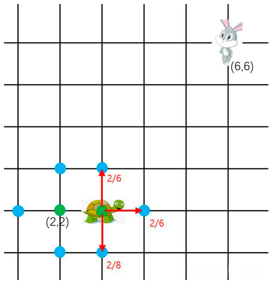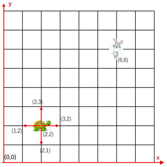 Suppose there is a turtle chasing a little white rabbit. The position of the turtle is as shown. The position of the little white rabbit is as shown. Suppose the little white rabbit is stationary. If the turtle can only move left, right, up, and down, then these are the points that the turtle can reach in the next round, and these points are called the points to be explored.