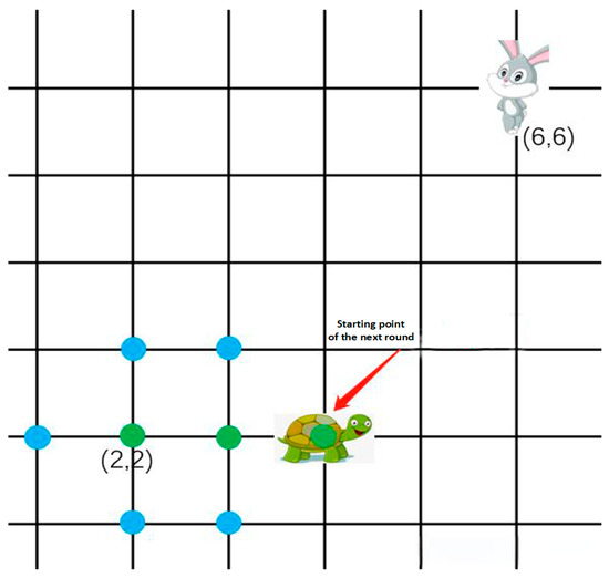 As shown in Figure 4, the next step is to find the points that the little turtle can go to in the next round and check whether the surrounding points are in the explored array alreadyfrontier. If they are, ignore them, and then check whether these points are already in the explored array frontier. If they are, compare the current cost G of the point with the current cost G2 required to reach the current position after passing through the little turtle’s current position. If G > G2, change the previous node of the point (which can be understood as the parent node) to the node where the little turtle is currently located, and update its current cost to G2.