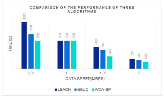 As shown in Figure 33, as the data transmission rate gradually increases, the network survival time also decreases. However, it can be seen that in all three cases, the improved algorithm has made some progress compared to the original algorithm. When the average network rate is 1 Mbps, the WOA-BP algorithm has the same effect as the LEACH algorithm and the EEUC algorithm. From the simulation experiment results, it can be seen that with a network speed greater than 1.5 Mbps, the WOA-BP algorithm has a short transmission time and a fast transmission rate.