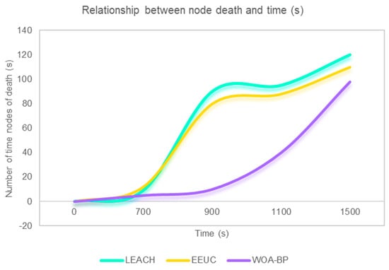 From the above Figure 34, it can be seen that at a runtime of 900, the LEACH algorithm and the EEUC algorithm have a wireless sensor node death rate of 80–100, while the optimized WOA-BP algorithm has a node death rate of 10.