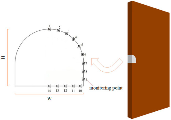 Field test data from the underground roadways of the Panlong Lead-Zinc Mine in Guangxi show that water pressure can significantly affect the strata where the roadway is located, with roadway construction occurring in a high hydraulic pressure environment. Therefore, considering fluid–solid coupling more accurately reflects the deformation patterns of the surrounding rock during actual underground roadway excavation. This paper uses the finite difference method software FLAC3D 6.00, which is based on the fast Lagrangian method, to establish a fluid–solid coupling model of the underground roadway. The seepage boundary conditions are determined by referring to the relevant literature [18,19,20] and considering the characteristics of high pore water pressure in deep roadways. The model’s seepage boundary conditions are as follows: we assume that the surrounding rock of the roadway before excavation is a saturated layer with the pore water pressure as hydrostatic, proportional to the depth of the roadway burial; the seepage boundary conditions are set with a fixed water head at the top, and impermeable boundaries on the left, right, and bottom sides, with the excavation boundary of the roadway being a free seepage boundary, allowing water to freely infiltrate into the interior of the roadway. The model’s dimensions utilizing symmetry and the distribution of displacement monitoring points on the surface of the roadway surrounding rock are shown in Figure 1. Due to the symmetry of the model, monitoring is only needed on one side; 14 monitoring points are uniformly arranged from top to bottom on the right side of the roadway as shown in the figure. Displacements at monitoring points 1–14 are denoted as . The total displacement in the roadway is defined as: