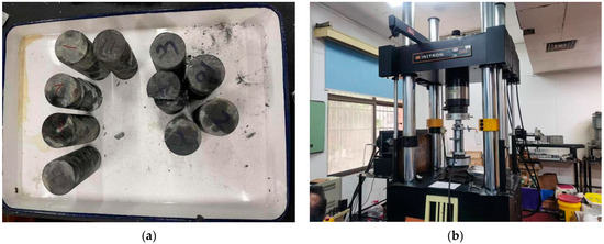 The selected typical rock samples were processed and polished into standard specimens, and conventional triaxial tests were conducted using an INSTRON 1346 type (INSTRON Corporation, Wycombe, UK) electro-hydraulic servo-controlled rigid material testing machine to determine mechanical parameters. The surrounding rock samples and the triaxial testing equipment are shown in Figure 2.