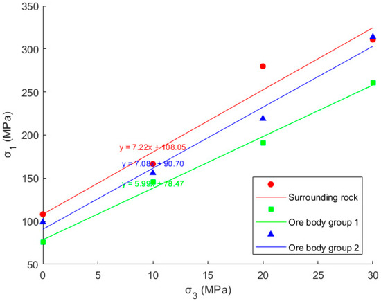 The typical curves showing the relationship between the axial and lateral stress difference () and axial strain obtained from the triaxial compression test of rock samples are shown in Figure 3. The best-fit relationship curves for and for each group of samples are shown in Figure 4.