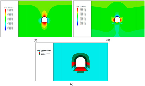 Surrounding rock stress and plastic zone distribution. (a) Vertical stress contour mapl; (b) horizontal stress contour map; (c) surrounding rock plastic zone distribution map.