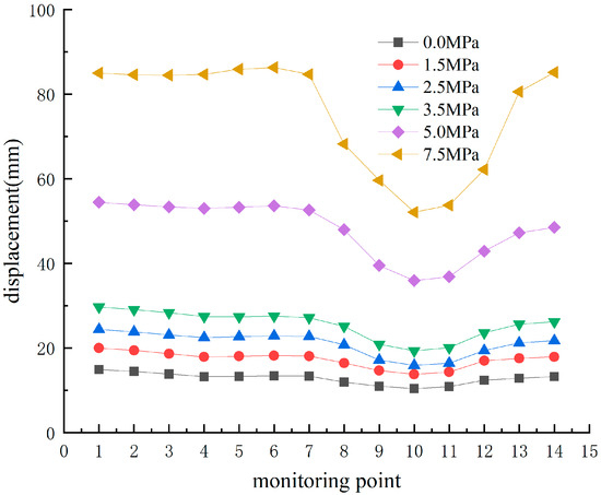 Taking the data graph of the displacement of monitoring points under various pore water pressure conditions as an example, when SRC = III, B = 600 m, H = 6 m, and W = 6 m, as shown in Figure 6, the study investigates the impact of pore water pressure on the deformation of surrounding rock. From Figure 6, it can be concluded that: