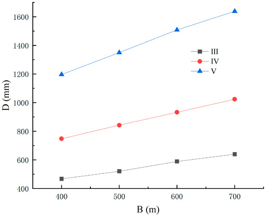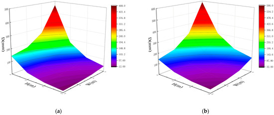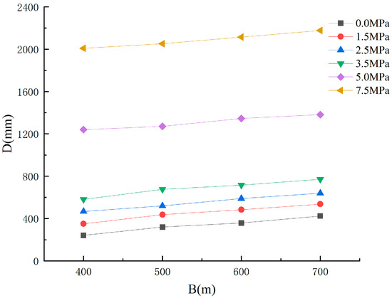 Taking the example of total displacement D of the surrounding rock for SRC = III, P = 2.5 MPa, B = 400 m or 600 m, and varying roadway cross-sectional dimensions (H, W) as illustrated in Figure 8, the study investigates the impact of roadway cross-sectional dimensions on surrounding rock deformation.