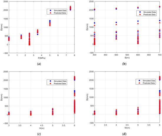 Regression model prediction validation. (a) Data points vary with changes in pore water pressure; (b) data points vary with changes in roadway burial depth; (c) data points vary with changes in roadway height; (d) data points vary with changes in roadway width.