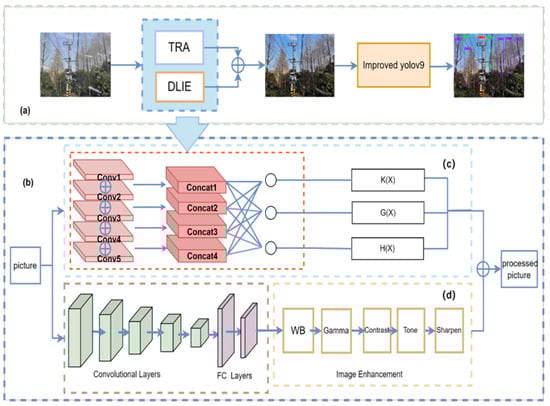 This study optimized the original network architecture to address the issues of error accumulation in the parameter estimation process, which can lead to incomplete image processing and distortion. To overcome these challenges, we employed a parallel architecture that combined the TRA image dehazing, deraining, and desnowing modules with the adaptive image enhancement module (DLIE). The resulting features were then integrated with the YOLOV9 detection network, creating an end-to-end object detection algorithm suitable for power scene images captured by drones under adverse weather conditions. The DLIE module consisted of five adaptable image enhancement parameters, essentially functioning as pixel-level filters. These parameters included the following: white balance (WB), which eliminated color deviations caused by atmospheric light; gamma correction, which restored details in darker areas; contrast enhancement, which improved overall visibility in regions affected by heavy fog, raindrops, or snowflakes; hue adjustment, which emphasized the overall atmosphere or produced specific effects; and image sharpening, which effectively enhanced the visual clarity of dehazed, derained, and desnowed images.