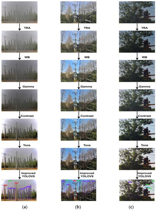 Uncontrollable factors such as the size, shape, position, orientation of the objects, and occlusions under adverse weather conditions make it difficult to achieve accurate detection using traditional convolutional operations on images that have already been processed and enhanced. Issues such as extensive false positives or negatives may arise. To address these challenges and improve the model’s ability to recognize objects like power lines and trees in images after processing, this paper proposes the incorporation of the Three-Layer Routing Attention module at the last part of the backbone. The Three-Layer Routing Attention module module was integrated into the entire network and underwent end-to-end training with appropriate loss functions, ensuring that the model could simultaneously learn image features, processing parameters, and attention weights. This adaptation enhanced the model’s focus and generalization capabilities for different image processing and enhancement tasks.