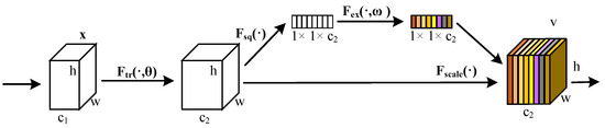 Figure 5. Squeeze-and-Excite. F t r -Standard convolution operation; F s q -Compressing the feature map R w × h × c 2 along the spatial dimensions ( w × h ); F e x -Generating weights for each feature channel through parameter ω ; F s c a l e -Recalibrating the feature map.