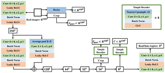 Our self-supervised D is shown in Figure 7, where the decoder consists of four convolutional layers and generates a 128 × 128 feature map. We used the decoder on feature maps 16 2 and 8 2 , randomly cropping 1/8 of the height and width of 16 2 , and then cropping the same part from the real image to obtain I p a r t . We resized the real image to obtain I, and the decoder generated I p a r t from the cropped 16 2 and I from 8 2 . D and the decoder were trained together to minimize the loss in Equation (2). This reconstruction training ensured that D extracted more comprehensive representations from the input images, including both global features (from 8 2 ) and fine texture details (from 16 2 ).