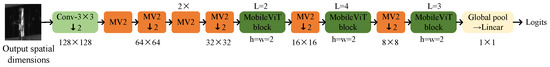 The network structure of MobileViT is shown in Figure 10. The initial layer is a stride 3 × 3 standard convolution, followed by two down-sampling operations. The subsequent layers consist of MobileNetv2 blocks (Figure 8a) and MobileViT blocks (Figure 8c). Finally, channel compression is performed using a 1 × 1 convolutional later followed by global average pooling. Swish [40] is used as the activation function. Following the CNN model, we set n = 3 for the MobileViT block. Since the spatial dimensions of the feature maps are usually a multiple of 2 and h, w ≤ n, we set h = w = 2 for all spatial levels.