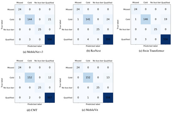 We trained our model on two sets of weld seam images: one set only augmented with geometric transformations and the other set augmented with both geometric transformations and FastGAN. In each experiment, we saved the model with the minimum loss value and the model with the highest validation accuracy and then tested it on the test set. The results of the classification network only trained on the weld seam images augmented with geometric transformations are shown in Table 2. The results of the classification network trained on the weld seam images augmented with both geometric transformations and FastGAN are shown in Table 3, and the recognition accuracy of the network for each type of weld seam images is shown in Table 4. The confusion matrices of different networks for different weld class classifications are shown in Figure 13. Table 5 shows the comparison results for different model parameter counts, FLOPs, and runtimes, where the runtimes are those from on a 1 NVIDIA V100 Tensor Core GPU.