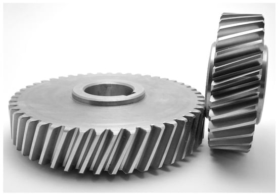 The test stand consisted of two gear pairs—the tested (item no. 1) and the stand (item no. 2). These were connected to each other using shafts (items no. 3 and 4). The torque was provided by preload applied by the load clutch (item no. 5). The electric motor (item no. 6), with the aid of belt transmission (item no. 7), covered only the power losses and provided rotational speed. The stand gear pair was designed in such a way as to have a much greater service life than the tested gears to maintain durability over all tests. A piezoelectric accelerometer (item no. 8) mounted on the case of the tested gear was used for the vibration measurements. The tested gear pairs (Figure 2) were the helical gears, and the data are listed in Table 1. The gear teeth were manufactured with a worm-shaped tool on a Koepfer EMAG 200 CNC (Koepfer gruppe, Furtwangen, Germany) gear hobbing machine from 42CrMo4 steel. The teeth surface profile was measured on a Mahr MarSurf GD 120 measuring machine (Mahr Federal Inc., Providence, RI, USA). Measured roughness parameters were Ra0.4 for pinion and Ra0.6 for gear. Gears were classified into the seventh accuracy grade based on measurements using the Klingelnberg P40 coordinate measuring machine.