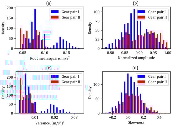 In the next step, a segment of the signal is transformed into the frequency domain with the aid of power spectral density (Paa) estimation according to Welch’s approach [30] (Figure 6c) with the Hann window function. Furthermore, the power spectral density is presented in dB scale by 10log(Paa) (Figure 6d). Finally, this logarithmic power spectral density is normalized (x at Figure 6e). The above-mentioned procedure performed for all measurements resulted in 880 normalized periodograms in the case of normal operation (gear pair I, load stages from 1 to 8), and 560 in the case of damaged gears (gear pair II, load stages from 2 to 5). Figure 7 shows the distribution of selected parameters of the obtained signals for two populations.