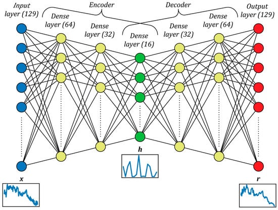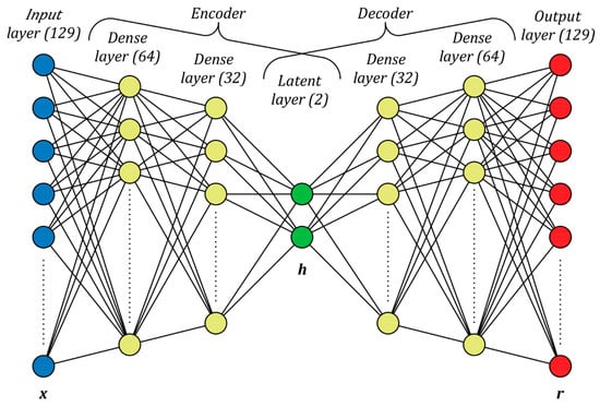 The autoencoder (AE) was designed as a deep neural network with five dense hidden layers (Figure 9). As input, the network takes normalized periodogram x (vector of length 129). This periodogram is next coded by the encoder to a vector h. The encoded vector h is the input layer for the decoder, which reconstructs it to vector r (output layer).